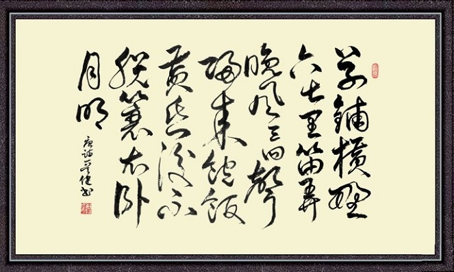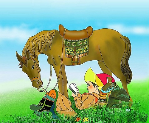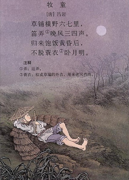 辽阔的草原像被铺在地上一样,四处都是草地。晚风中隐约传来牧童断断续续悠扬的笛声。牧童放牧归来,在吃饱晚饭后的晚霞时分。他连蓑衣都没脱,就躺在草地上看天空中的圆月。