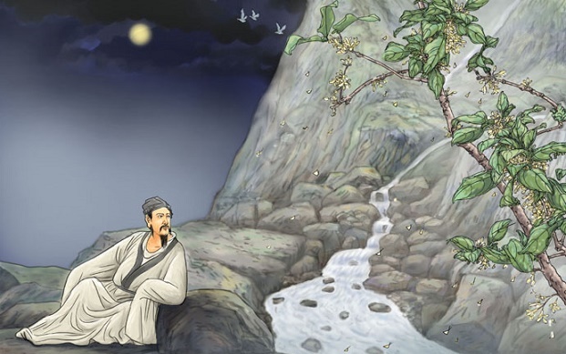 桂树枝叶繁茂,而花瓣细小。花落,尤其是在夜间,并不容易觉察。因此,开头“人闲”二字不能轻易看过。“人闲”说明周围没有人事的烦扰,说明诗人内心的闲静。有此作为前提,细微的桂花从枝上落下,才被觉察到了。诗人能发现这种“落”,或仅凭花落在衣襟上所引起的触觉,或凭声响,或凭花瓣飘坠时所发出的一丝丝芬芳。总之,“落”所能影响于人的因素是很细微的。而当这种细微的因素,竟能被从周围世界中明显地感觉出来的时候,诗人则又不禁要为这夜晚的静谧和由静谧格外显示出来的空寂而惊叹了。这里,诗人的心境和春山的环境气氛,是互相契合而又互相作用的。