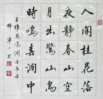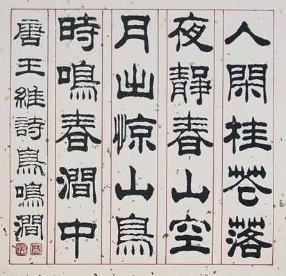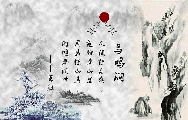 月出惊山鸟,时鸣春涧中。出自唐代诗人王维作品《鸟鸣涧》,是诗人所作组诗《皇甫岳云溪杂题五首》的第一首。此诗描绘山间春夜中幽静而美丽的景色,侧重于表现夜间春山的宁静幽美。全诗紧扣一“静”字着笔,极似一幅风景写生画。诗人用花落、月出、鸟鸣等活动着的景物,突出地显示了月夜春山的幽静,取得了以动衬静的艺术效果,生动地勾勒出一蝠“鸟鸣山更幽”的诗情画意图。全诗旨在写静,却以动景处理,这种反衬的手法极见诗人的禅心与禅趣。