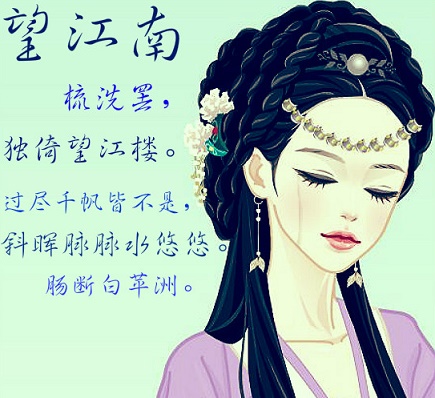 ⑴望江南:又名“梦江南”“忆江南”,原唐教坊曲名,后用为词牌名。段安节《乐府杂录》:“《望江南》始自朱崖李太尉(德裕)镇浙日,为亡妓谢秋娘所撰,本名“谢秋娘”,后改此名。”《金奁集》入“南吕宫”。小令,单调二十七字,三平韵。