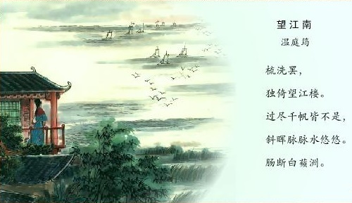 接着,出现了一幅广阔、多彩的艺术画面:“独倚望江楼。”江为背景,楼为主体,焦点是独倚的人。这时的女子,感情是复杂的;随着时间的推移,情绪是变化的。初登楼时的兴奋喜悦,久等不至的焦急,还有对往日的深沉追怀……这里,一个“独”字用得很传神。“独”字,既无色泽,又无音响,却意味深长。这不是恋人昵昵情语的“互倚”,也不是一群人叽叽喳喳的“共倚”,透过这无语独倚的画面,反映了人物的精神世界。一幅美人凭栏远眺图,却是“误几回天际识归舟”的“离情正苦”。把人、景、情联系起来,画面上就有了盛妆女子和美丽江景调和在一起的斑斓色彩,有了人物感情变化和江水流动的交融。