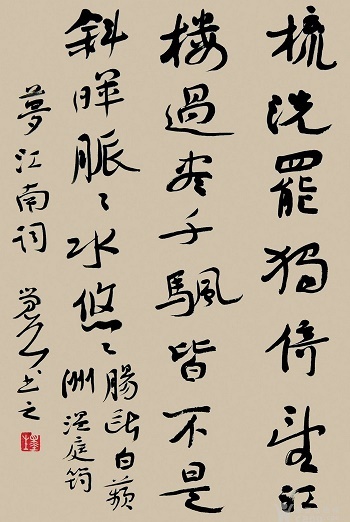 梳洗罢,独倚望江楼。出自唐代诗人温庭筠作品《望江南·梳洗罢》。这是一首写闺怨的小令。此词以江水、远帆、斜阳为背景,截取倚楼顒望这一场景,以空灵疏荡之笔塑造了一个望夫盼归、凝愁含恨的思妇形象。全词表现了女主人公从希望到失望以致最后的“肠断”的感情,情真意切,语言精练含蓄而余意不尽,没有矫饰之态和违心之语,风格清丽自然,是温词中别具一格的精品。