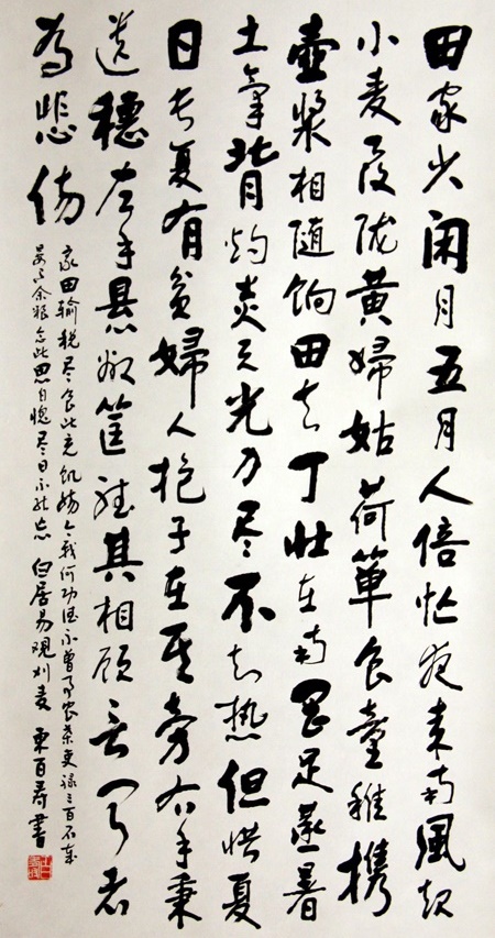 白居易是一位最擅长写叙事诗的艺术巨匠。他的叙事诗能曲尽人情物态,把其中所叙的事件写得曲折详尽,娓娓动听。而且,他的叙事诗里总是有着心灵的揭示,因而总是蕴含着感情的。在《观刈麦》里,他虽然着墨不多,但是却把割麦者与拾麦者在夏收时那种辛勤劳碌而又痛苦的生活情景,描写得生动真切,历历如画。不仅写了事,而且写了心,包括作者本人的心和劳动人民的心。诗人的心弦显然是被耳闻目睹的悲惨景象振动了,颤栗了,所以才提起笔来直歌其事,所以在字里行间都充满对劳动者的同情和怜悯。像“足蒸暑土气,背灼炎天光”、“家田输税尽,拾此充饥肠”这样的诗句,里面包含着作者无限的同情之感与怜悯之意。因而这首《观刈麦》在叙事当中是有着作者情的渗透、心的跳动的,作者的心同他所叙的事是融为一体的。值得称道的是,作者在真实地写劳动人民之事的同时,还能够真实地写出劳动人民之心,尤其是刻画出劳动人民在某种特定情况下的变态心理,深刻地揭示诗的主题。《卖炭翁》中“可怜身上衣正单,心忧炭贱愿天寒”,写的是卖炭老人为衣食所迫而产生的变态心理。《观刈麦》中的“力尽不知热,但惜夏日长”,同样也是一种变态心理。这类描写把劳动人民之心刻画入微,深入底蕴。诗中写事与写心的完美统一,较之一般的叙事与抒情的统一,更能震撼人心。白居易又是运用对比手法的能手。他在诗歌创作中,不仅把劳动人民的贫困、善良与地主阶级的奢侈、暴虐作了对比,而且还把自己的舒适与劳动人民的穷苦作了对比。这首诗在写了农民在酷热的夏天的劳碌与痛苦之后,诗人同样也联想到自己,感到自己没有“功德”,又“不事农桑”,可是却拿“三百石”俸禄,到年终还“有余粮”,因而“念此私自愧,尽日不能忘”。诗人在那个时代能够主动去和农民对比,十分难得。这样一种对比,真是新颖精警,难能可贵,发人深省,因而更显出这首诗的思想高度。