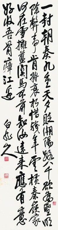 “云横”、“雪拥”,既是实景,又不无象征意义。“蓝关”形容关山险恶,归途渺渺,前途茫茫,“雪拥蓝关”语意双关,明写天气寒冷,暗写政治气候恶劣。“马不前”其实是人不前,三字中流露出作者英雄失落之悲,表现了诗人对亲人、对国都的眷顾与依恋。这句借景语言情思,诗人忠而获罪,远贬潮阳,抛妻别子而南行,心中是极其伤痛的。一封朝奏九重天,夕贬潮阳路八千。 表现韩愈被贬原因。这一联,景阔情悲,蕴涵深广,遂成千古名句。作者原是抱着必死的决心上表言事的,如今自料此去必死,故对韩湘安排后事,以“好收吾骨”作给。在章法上,又照应第二联,故语虽悲酸,却悲中有壮,表现了“为除弊事”而“不惜残年”的坚强意志。