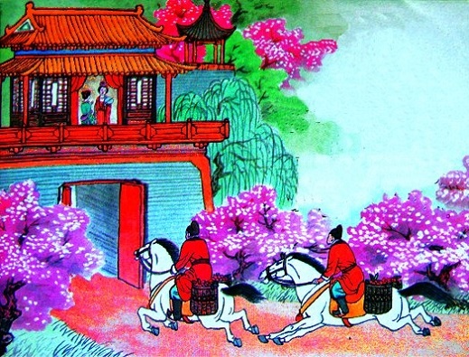 接着,场景向前推进,展现出山顶上那座雄伟壮观的行宫。平日紧闭的宫门忽然一道接着一道缓缓地打开了。接下来,又是两个特写镜头:宫外,一名专使骑着驿马风驰电掣般疾奔而来,身后扬起一团团红尘;宫内,妃子嫣然而笑了。几个镜头貌似互不相关,却都包蕴着诗人精心安排的悬念:“千门”因何而开?“一骑”为何而来?“妃子”又因何而笑?诗人故意不忙说出,直至紧张而神秘的气氛憋得读者非想知道不可时,才含蓄委婉地揭示谜底:“无人知是荔枝来。”“荔枝”两字,透出事情的原委。《新唐书·杨贵妃传》:“妃嗜荔枝,必欲生致之,乃置骑传送,走数千里,味未变,已至京师。”明于此,那么前面的悬念顿然而释,那几个镜头便自然而然地联成一体了。