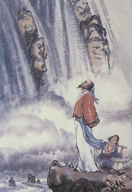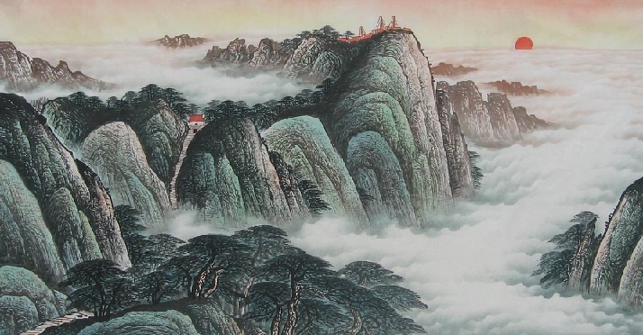 挟澄源、奴子仍下峡路。至天都侧,从流石蛇行而上。攀草牵棘,石块丛起则历块,石崖侧削则援崖。每至手足无可着处,澄源必先登垂接。每念上既如此,下何以堪?终亦不顾。历险数次,遂达峰顶。惟一石顶壁起犹数十丈,澄源寻视其侧,得级,挟予以登。万峰无不下伏,独莲花与抗耳。时浓雾半作半止,第一阵至,则对面不见。眺莲花诸峰,多在雾中。独上天都,予至其前,则雾徙于后;予越其右,则雾出于左。其松犹有曲挺纵横者;柏虽大于如臂,无不平贴石上、如苔藓然。山高风巨,雾气去来无定。下盼诸峰,时出为碧峤(jiào)尖而高的山,时没为银海。再眺山下,则日光晶晶,别一区宇也。日渐暮,遂前其足,手向后据地,坐而下脱。至险绝处,澄源并肩手相接。度险,下至山坳,暝色已。复从峡度栈以上,止文殊院。