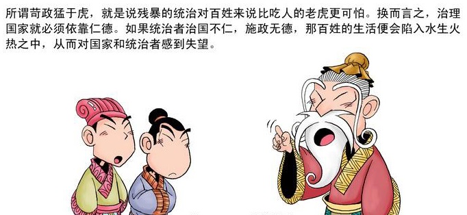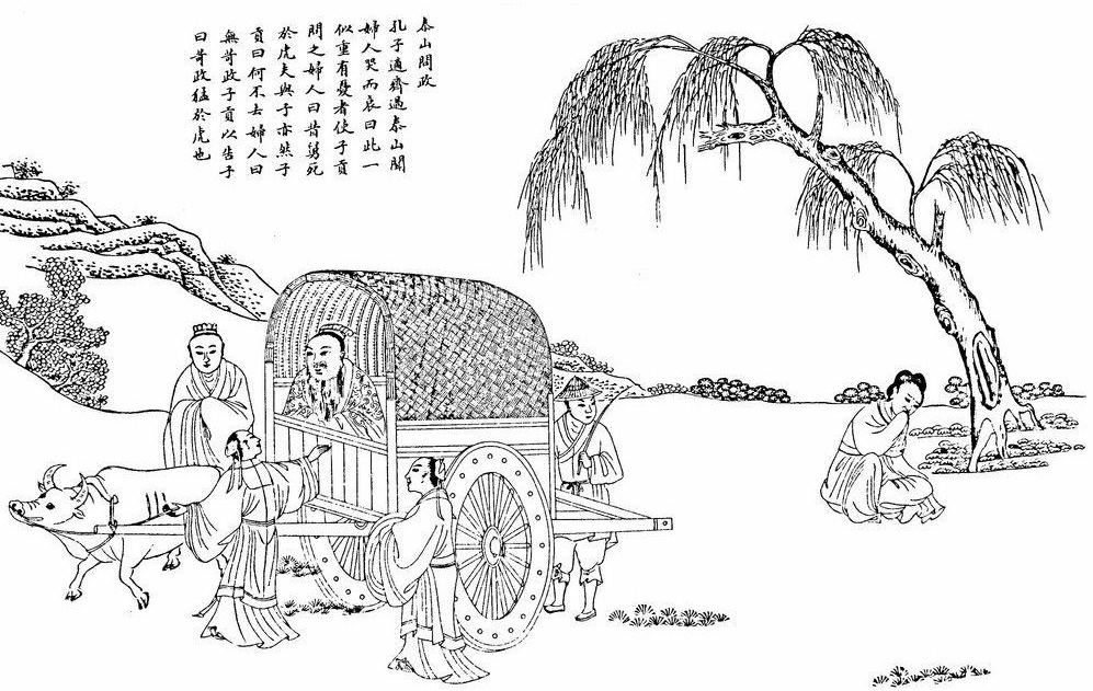 孔子路过泰山脚下,有一个妇人在墓前哭得很悲伤。孔子扶着车前的横木听妇人的哭声,让子路前去问那个妇人。子路问道:“您这样哭,实在像连着有了几件伤心事似的。”(妇人)就说:“没错,之前我的公公被老虎咬死了,后来我的丈夫又被老虎咬死了,现在我的儿子又死在了老虎口中!”孔子问:“那为什么不离开这里呢?”(妇人)回答说:“(这里)没有残暴的政令。”孔子说:“年轻人要记住这件事,苛刻残暴的政令比老虎还要凶猛可怕啊!”