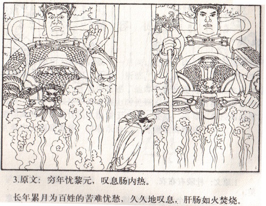 接着写到家并抒发感慨。一进门,就听见家人在号啕大哭,这是非常戏剧化的。“幼子饿已卒”,“无食致夭折”,景况是凄惨的。“吾宁舍一哀”,用《礼记·檀弓》记孔子的话:“遇于一哀而出涕,予恶夫涕之无从也。”“舍”字有割舍放弃的意思,这里的意思是:“我能够勉强达观自遣,但邻里且为之呜咽,况做父亲的人让儿子生生的饿死,岂不惭愧。时节过了秋收,粮食原不该缺乏,穷人可还不免有仓皇挨饿的。像自己这样,总算很苦的了。”诗人当时不一定非常困苦,因为他大小总是个官儿,照例可以免租税和兵役的,但他尚且狼狈得如此,那么一般平民扰乱不安的情况,就要远远胜过他了。弱者填沟壑,强者想造反,都是一定的。诗人想起世上有很多失业之徒,久役不归的兵士,那些武行脚色已都扎扮好了,只等上场锣响,便要真杀真砍,大乱的来临已迫在眉睫,他的忧愁从中而来,不可断绝,犹如与终南山齐高,与大海一样茫茫无际。表面看来,似乎穷人发痴,痴人说梦,但实际上过不了多久,安史之乱一爆发,渔阳鼙鼓就揭天而来了,这也正体现了诗人的真知灼见。