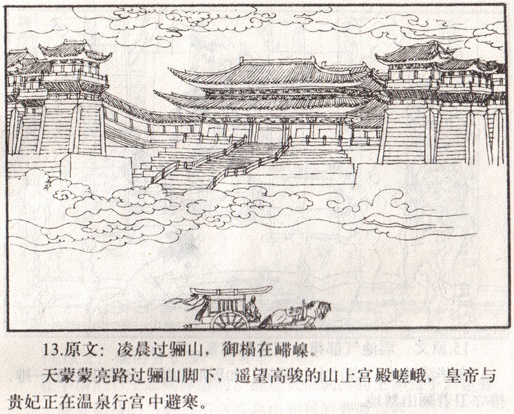 第二段从“岁暮百草零”至“惆怅难再述”。这一段,记叙、描写、议论并用。首六句叙上路情形,在初冬十月、十一月之交,半夜动身,清早过骊山,玄宗和贵妃正在华清宫。“蚩尤”两句的旧注多有错误。蚩尤曾经作雾,即用作“雾”的代语,下面说“塞寒空”即是雾。在这里,只见雾塞寒空,雾重故地滑。温泉蒸气郁勃,羽林军校往来如织。骊宫冬晓,气象万千。寥寥数笔,写出了真正的华清宫。“君臣留欢娱,乐动殷胶葛”两句亦即白居易《长恨歌》所说的“骊宫高处入青云,仙乐风飘处处闻”。说“君臣留欢娱”,轻轻点过,却把唐玄宗一起拉到浑水里去。上文所谓“尧舜之君”,不过是诗人说说好听,遮遮世人眼罢了。