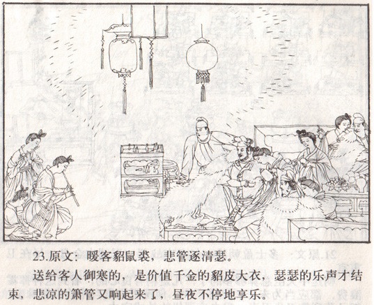 诗中不宜再尖锐地说下去,所以转入平铺。“煖客”以下四句两联,十字作对,称之为隔句对或者扇面对,调子相当地纡缓。因意味太严重了,不能不借藻色音声的曼妙渲染一番,稍稍冲淡。其实,纡缓中又暗蓄进逼之势。貂鼠裘,驼蹄羹,霜橙香橘,各种珍品尽情享受,酒肉凡品,不须爱惜。在这里,本来文势稍宽平了一点儿,诗人又紧接着大声疾呼:“朱门酒肉臭,路有冻死骨。”一句也不肯放松,一笔也不肯落平。这是传诵千古的名句。表面上一往高歌,暗地里却结上启下,令读者不觉,《杜诗镜铨》里评价说“拍到路上无痕”,讲得很对。骊山宫装点得像仙界一般,而宫门之外即有路倒尸。咫尺之间,荣枯差别这样大,那也没有什么可说的了。诗人不能再说,亦无须再说了。在这儿打住,是很恰当的。