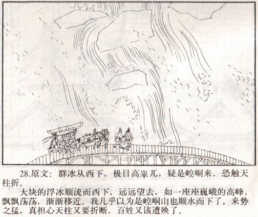 河上的桥梁幸好还没有冲毁,桥柱子却吱吱呀呀,摇晃震颇。河面这么宽,谁能飞越!旅客们只好牵挽过桥,顾不得危险。