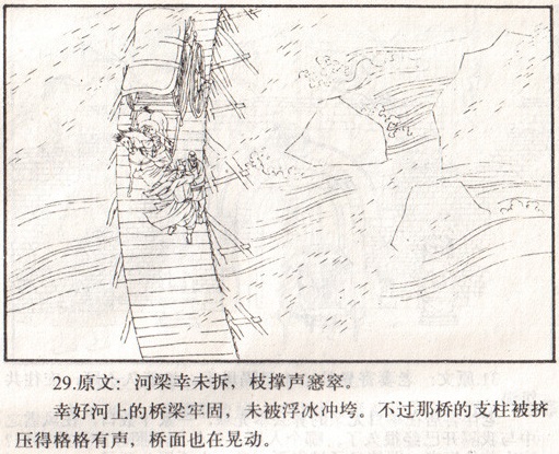河上的桥梁幸好还没有冲毁,桥柱子却吱吱呀呀,摇晃震颇。河面这么宽,谁能飞越!旅客们只好牵挽过桥,顾不得危险。