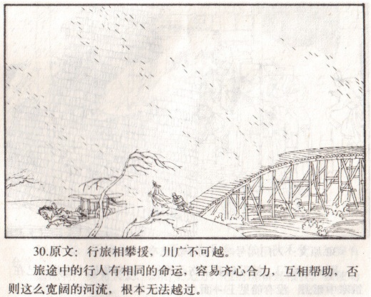 河上的桥梁幸好还没有冲毁,桥柱子却吱吱呀呀,摇晃震颇。河面这么宽,谁能飞越!旅客们只好牵挽过桥,顾不得危险。