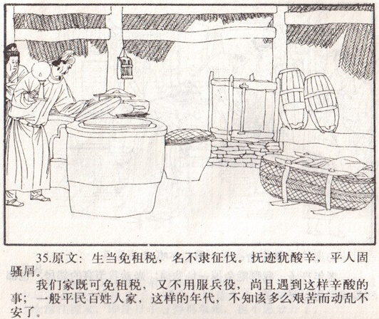 接着写到家并抒发感慨。一进门,就听见家人在号啕大哭,这是非常戏剧化的。“幼子饿已卒”,“无食致夭折”,景况是凄惨的。“吾宁舍一哀”,用《礼记·檀弓》记孔子的话:“遇于一哀而出涕,予恶夫涕之无从也。”“舍”字有割舍放弃的意思,这里的意思是:“我能够勉强达观自遣,但邻里且为之呜咽,况做父亲的人让儿子生生的饿死,岂不惭愧。时节过了秋收,粮食原不该缺乏,穷人可还不免有仓皇挨饿的。像自己这样,总算很苦的了。”诗人当时不一定非常困苦,因为他大小总是个官儿,照例可以免租税和兵役的,但他尚且狼狈得如此,那么一般平民扰乱不安的情况,就要远远胜过他了。弱者填沟壑,强者想造反,都是一定的。诗人想起世上有很多失业之徒,久役不归的兵士,那些武行脚色已都扎扮好了,只等上场锣响,便要真杀真砍,大乱的来临已迫在眉睫,他的忧愁从中而来,不可断绝,犹如与终南山齐高,与大海一样茫茫无际。表面看来,似乎穷人发痴,痴人说梦,但实际上过不了多久,安史之乱一爆发,渔阳鼙鼓就揭天而来了,这也正体现了诗人的真知灼见。
