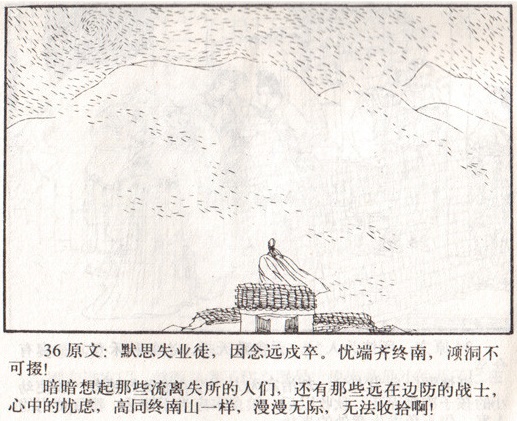 接着写到家并抒发感慨。一进门,就听见家人在号啕大哭,这是非常戏剧化的。“幼子饿已卒”,“无食致夭折”,景况是凄惨的。“吾宁舍一哀”,用《礼记·檀弓》记孔子的话:“遇于一哀而出涕,予恶夫涕之无从也。”“舍”字有割舍放弃的意思,这里的意思是:“我能够勉强达观自遣,但邻里且为之呜咽,况做父亲的人让儿子生生的饿死,岂不惭愧。时节过了秋收,粮食原不该缺乏,穷人可还不免有仓皇挨饿的。像自己这样,总算很苦的了。”诗人当时不一定非常困苦,因为他大小总是个官儿,照例可以免租税和兵役的,但他尚且狼狈得如此,那么一般平民扰乱不安的情况,就要远远胜过他了。弱者填沟壑,强者想造反,都是一定的。诗人想起世上有很多失业之徒,久役不归的兵士,那些武行脚色已都扎扮好了,只等上场锣响,便要真杀真砍,大乱的来临已迫在眉睫,他的忧愁从中而来,不可断绝,犹如与终南山齐高,与大海一样茫茫无际。表面看来,似乎穷人发痴,痴人说梦,但实际上过不了多久,安史之乱一爆发,渔阳鼙鼓就揭天而来了,这也正体现了诗人的真知灼见。