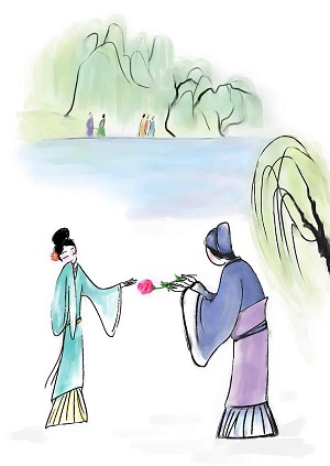 送我野外香勺药, 勺药美丽又奇异。不是勺药本身美, 宝贵只因美人赠。