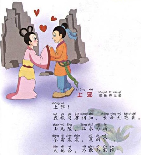 《上邪》为《铙歌十八曲》之一,属乐府《鼓吹曲辞》。《上邪》是一首民间情歌,是一首感情强烈,气势奔放的爱情诗。诗中女子为了表达她对情人忠贞不渝的感情。她指天发誓,指地为证,要永远和情人相亲相爱。