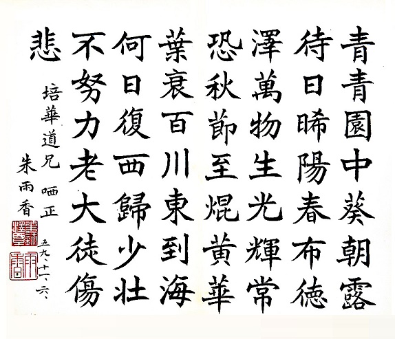 自然界的时序不停交换,转眼春去秋来,园中葵及万物经历了春生、夏长,到了秋天,它们成熟了,昔日奕奕生辉的叶子变得焦黄枯萎,丧失了活力。人生也是如此,由青春勃发而长大,而老死,也要经历一个新陈代谢的过程。这是一个不可移易的自然法则。诗人用“常恐秋节至”表达对“青春”稍纵即逝的珍惜,其中一个“恐”字,表现出人们对自然法则的无能为力,青春凋谢的不可避免。接着又从时序的更替联想到宇宙的无尽时间和无垠空间,时光像东逝的江河,一去不复返。由时间尺度来衡量人的生命也是老死以后不能复生。在这永恒的自然面前,人生就像叶上的朝露一见太阳就被晒干了,就像青青葵叶一遇秋风就枯黄凋谢了。诗歌由对宇宙的探寻转入对人生价值的思考,终于推出“少壮不努力,老大徒伤悲”这一发聋振聩的结论,结束全诗。这个推理的过程,字面上没有写出来,但读者可循着诗人思维的轨迹,用自己的人生体验来补足:自然界的万物有一个春华秋实的过程;人生也有一个少年努力、老有所成的过程。自然界的万物只要有阳光雨露,秋天自能结实,人却不同;没有自身努力是不能成功的。万物经秋变衰,但却实现了生命的价值,因而不足伤悲;人则不然,因“少壮不努力”而老无所成,就等于空走世间一趟。调动读者思考,无疑比代替读者思考高明。正由于此,使这首诗避免了容易引人生厌的人生说教,使最后的警句显得浑厚有力,深沉含蓄,如洪钟长鸣一般,深深地打动了读者的心。句末中的“徒”字意味深长:一是说老大无成,人生等于虚度了;二是说老年时才醒悟将于事无补,徒叹奈何,意在强调必须及时努力。