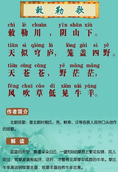 ①《敕勒歌》:敕勒(chì lè):种族名,北齐时居住在朔州(今山西省北部)一带。