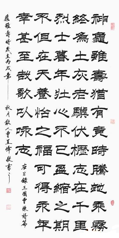 “盈缩之期,不但在天;养怡之福,可得永年。”表现出一种深沉委婉的风情,给人一种亲切温馨之感。全诗跌宕起伏,又机理缜密,闪耀出哲理的智慧之光,并发出奋进之情,振响着乐观声调。艺术风格朴实无华,格调高远,慷慨激昂,显示出诗人自强不息的进取精神,热爱生活的乐观精神。