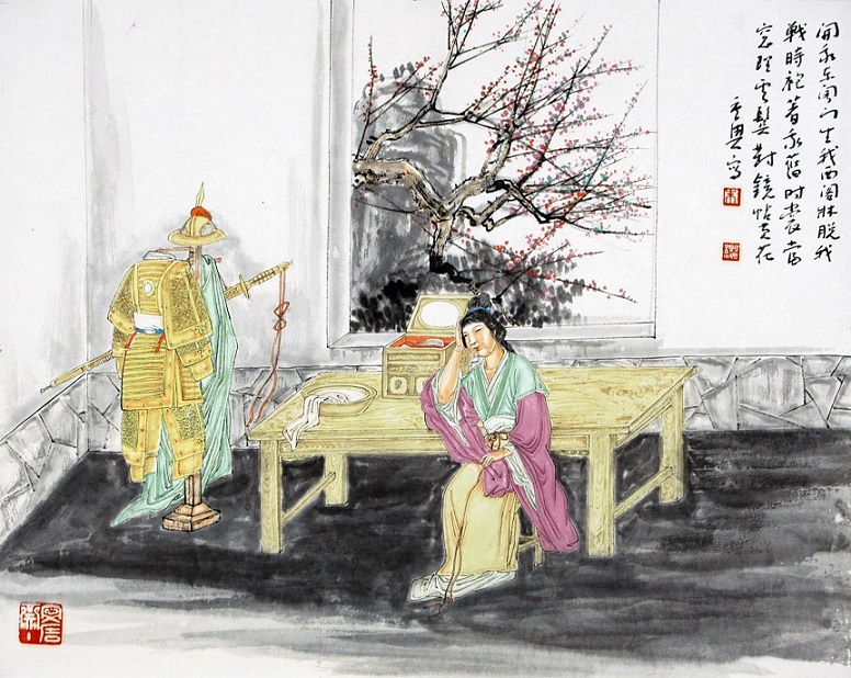 而对木兰重入闺房,再着“女儿妆”的一段描写,更是淋漓尽致地渲染了木兰的热爱生活、美丽可爱的女儿情态。