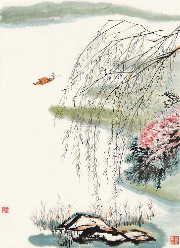 该诗首句是说一只漂亮的画船系在岸边的柳树上,表现的是一个“等”字。“亭亭”多用来形容姑娘之苗条、靓丽,作者却用来描写船,可见作者的构思不同一般。“系”的后面省略了宾语,与刘禹锡的“只有垂杨绾别离”手法相同,且暗切题意,手法不同凡响。“春潭”化用李白的“桃花潭水深千尺”,用笔老到,布局精巧。该句中没有正面写柳,但“系”字和诗题相照应,已暗示了所系之处。古代有折柳赠别的风俗,因为“柳”谐“留”音,寓有惜别之意,因此,首联所展示的系舟杨柳岸的画面,恰是一幅春江送别图。