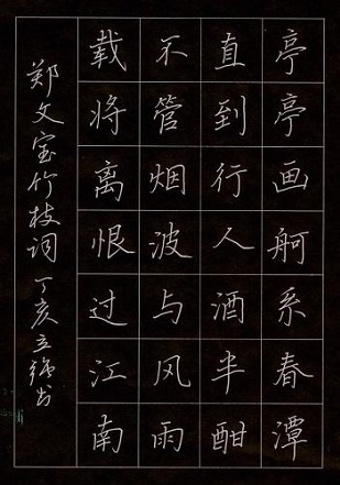 亭亭画舸系春潭,直到行人酒半酣。出自北宋郑文宝所创作的一首七言绝句《柳枝词》,该诗写离恨,用了反衬手法寄寓了作者离别时的不舍。该诗意境优美,情感真挚,实际上是借对友人的毫无道理的埋怨进一步抒发自己依依不舍的真挚情谊。