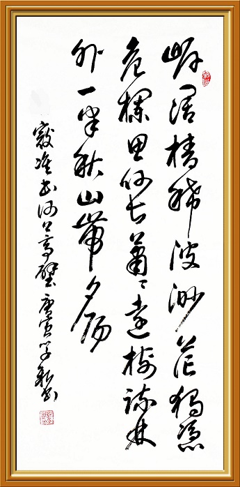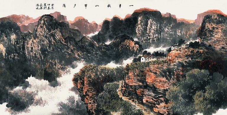 萧萧远树疏林外,一半秋山带夕阳。出自北宋诗人寇准创作的一首七言绝句《书河上亭壁》,题写在黄河边一座亭子的壁上,以描写秋天的景色为主。诗前两句写黄河,及因黄河勾起的无边的愁思。诗人用的线条很粗,着眼于大景。三、四句写远处,说萧瑟秋风中,依稀可见一片凋落的树林,林后的山脉,一半浸沉在夕阳照射中。诗构出一个令人愁怨的气氛,描写出令人愁怨的场景,隐括诗人的心情,显得含蓄深致。自然之景与人的感慨紧紧结合,诗境诗意都得到了全面地发挥。