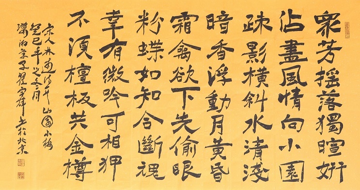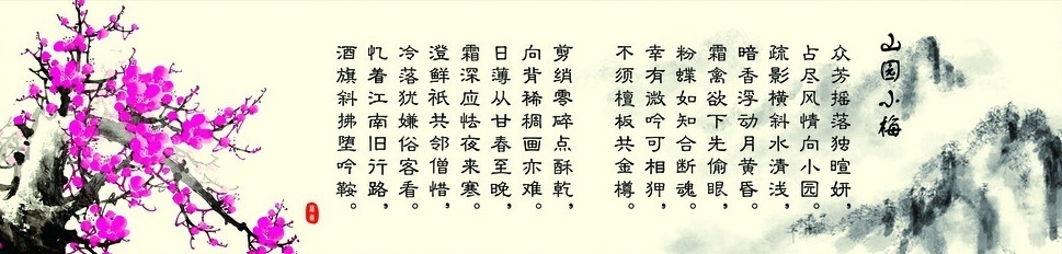 百花落尽后只有梅花绽放得那么美丽、明艳,成为小园中最美丽的风景梅枝在水面上映照出稀疏的倒影,淡淡的芳香在月下的黄昏中浮动飘散。冬天的鸟要停落在梅枝上先偷偷观看,夏日的蝴蝶如果知道这梅花的美丽应该惭愧得死去。幸好可以吟诗与梅花亲近,既不需要拍檀板歌唱,也不用金樽饮酒助兴。