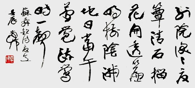 诗的前三句着力在炎热的夏天描绘出一派清幽的世界,以衬托午睡的舒适。第一句写午睡的场所,“深深”说明别院深幽寂静,因为寂静,而感到了“清”,体现出物我之间的通感,使人直观地感觉到在这里午睡的宜人。第二句写院外的环境。院内屋中是一味清凉,窗外榴花盛开,透过窗帘,仍能感觉到它艳丽的色彩。可以想象,诗人躺在席子上,榴花映照屋内,颜色柔和,带有催眠的作用。第三句把上两句所说加以综合,点出中午这个时间,说庭院深深,午时也绿阴遍地,凉意沁人。通过上面三句,午睡的各项条件都已具备,可接手写午睡了,诗却一下跳开,直接写梦醒,用笔灵活。梦醒后宁谧,又通过不时传来断续的莺声来反衬。睡醒后恬静舒适,睡觉时恬静舒适也就可想而知了,这就是诗人想表现的“夏意”。