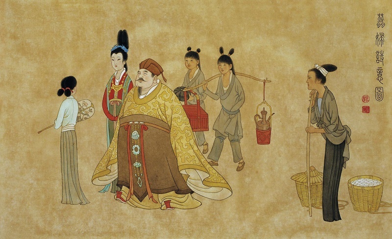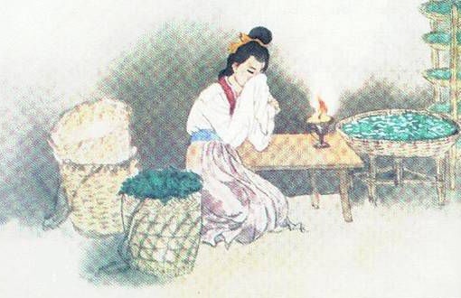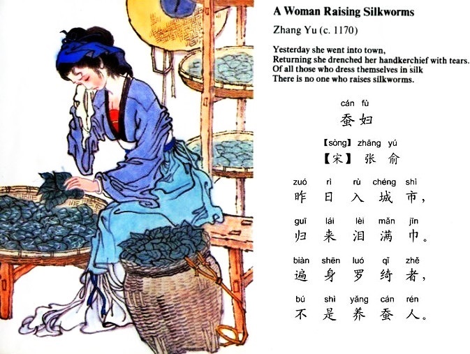 一个住在乡下以养蚕为生的妇女,昨天到城镇里去赶集并且出售蚕丝。回来的时候,她却是泪流不断,伤心的泪水把手巾都浸湿了。因为她在集市中看到,全身穿着美丽的丝绸衣服的人,根本不是像她这样辛苦劳动的养蚕人。