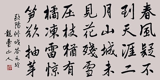 诗的首联“春风疑不到天涯,二月山城未见花”,破“早春”之题:夷陵小城,地处偏远,山重水满,虽然已是二月,却依然春风难到,百花未开。既叙写了作诗的时间、地点和山城早春的气象,又抒发了自己山居寂寞的情怀。“春风不到天涯”之语,暗离皇恩不到,透露出诗人被贬后的抑郁情绪,大有“春风不度玉门关”之怨旨。这一联起得十分超妙,前句问,后句答。欧阳修自己也很欣赏,他说:“若无下句,则上句何堪?既见下句,则上句颇工。”(《笔说》)正因为这两句破题巧妙,为后面的描写留有充分的余地,所以元人方回说:“以后句句有味。”(《瀛奎律髓》)