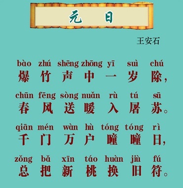 此诗描写春节除旧迎新的景象。一片爆竹声送走了旧的一年,饮着醇美的屠苏酒感受到了春天的气息。初升的太阳照耀着千家万户,家家门上的桃符都换成了新的。