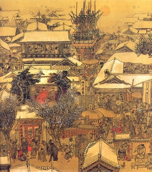 第三句“千门万户曈曈日”,承接前面诗意,是说家家户户都沐浴在初春朝阳的光照之中。结尾一句描述转发议论。挂桃符,这也是古代民间的一种习俗。“总把新桃换旧符”,是个压缩省略的句式,“新桃”省略了“符”字,“旧符”省略了“桃”字,交替运用,这是因为七绝每句字数限制的缘故。