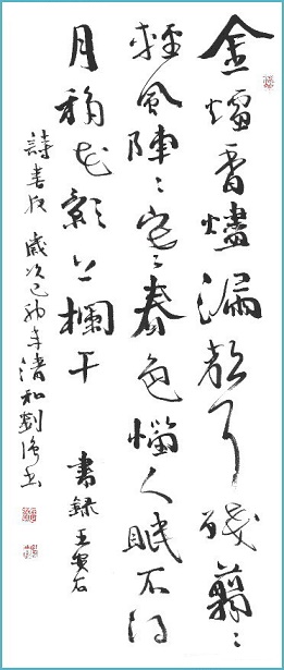夜已经深了,香炉里的香早已经燃尽,漏壶里的水也快漏完了。后半夜的春风给人带来阵阵的寒意。然而春天的景色却使人心烦意乱,只看见随着月亮的移动,花木的影子悄悄地爬上了栏杆。