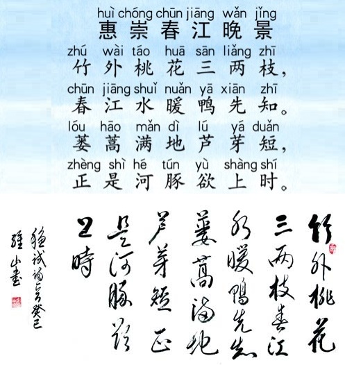 著名国画史学家郭若虚说他“工画鹅、雁、鹭鸶,尤工小景,善为寒江远渚。萧洒虚旷之景,人所难到也”(《图画见闻志》卷四)。由此可见,惠崇的画享誉一时,而《春江晚景》(钱钟书《宋诗选注》作“晚景”)应是他擅长的得意之作。惠崇原画已经失传,但从诗人传神的描写中,我们可以想到画面图景。北宋诗人晁补之说:“诗传画外意,贵有画中态。”(《和苏翰林题李甲画雁》)苏轼的这首诗妙在既能写出“画中态”,又能传出“画外意”,使诗情、画意完美地结合起来。