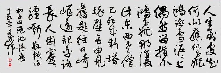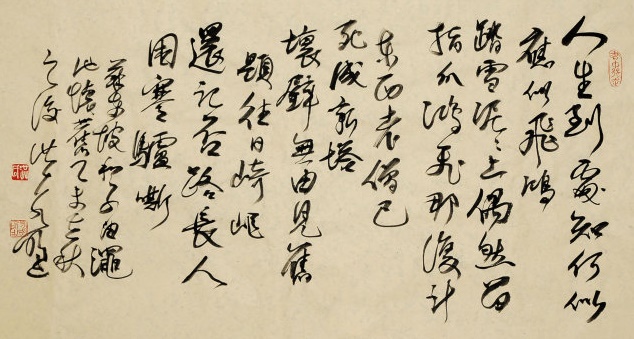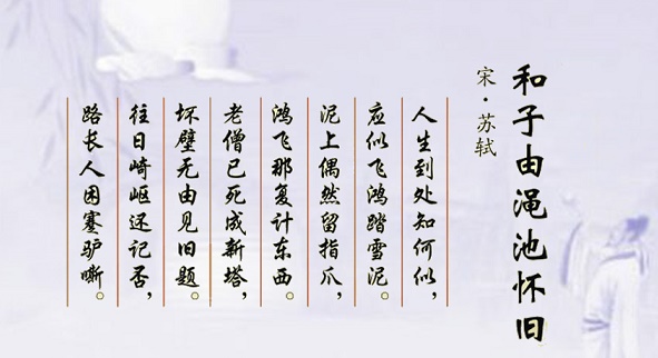 前四句一气贯串,自由舒卷,超逸绝伦,散中有整,行文自然。首联两句,以雪泥鸿爪比喻人生。一开始就发出感喟,有发人深思、引人入胜的作用,并挑起下联的议论。次联两句又以“泥”“鸿”领起,用顶针格就“飞鸿踏雪泥”发挥。鸿爪留印属偶然,鸿飞东西乃自然。偶然故无常,人生如此,世事亦如此。他用巧妙的比喻,把人生看作漫长的征途,所到之处,诸如曾在渑池住宿、题壁之类,就像万里飞鸿偶然在雪泥上留下爪痕,接着就又飞走了;前程远大,这里并非终点。人生的遭遇既为偶然,则当以顺适自然的态度去对待人生。果能如此,怀旧便可少些感伤,处世亦可少些烦恼。苏轼的人生观如此,其劝勉爱弟的深意亦如此。此种亦庄亦禅的人生哲学,符合古代士大夫的普遍命运,亦能宽解古代士大夫的共同烦恼,所以流布广泛而久远。