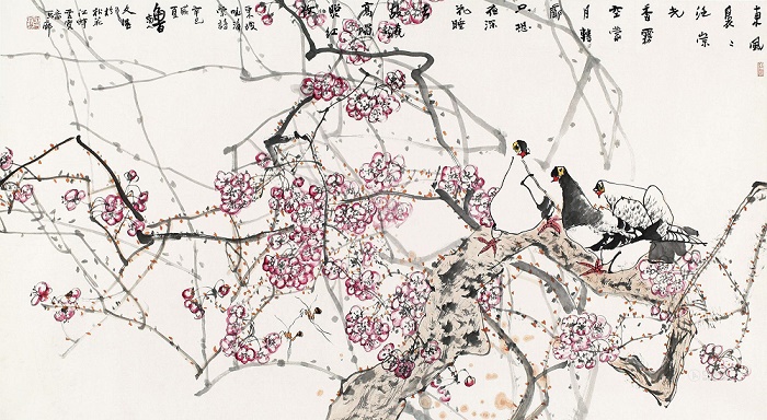 此诗开头两句,并不拘限于正面描写。首句“东风袅袅”形容春风的吹拂之态,化用了《楚辞·九歌·湘夫人》中的“袅袅兮秋风”之句。着一“泛”字,活写出春意的暖融,这为海棠的盛开造势。次句侧写海棠,“香雾空蒙”写海棠阵阵幽香在氤氲的雾气中弥漫开来,沁人心脾。“月转廊”,月亮已转过回廊那边去了,照不到这海棠花;暗示夜已深,人无寐,从中还可读出一层隐喻:处江湖之僻远,不遇君王恩宠。这两句把读者带入一个空濛迷幻的境界,十分艳丽,然而略显幽寂。