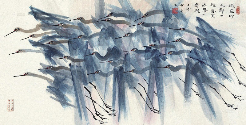 意境上看,前面描绘出落晖,后面冲飞入天,融人晚霞,更为壮美。这里,既有绘画美,又有色彩美,更因群鸟齐飞,呱呱乱叫,传送出声态美。真是景象飞动,诗趣盎然。