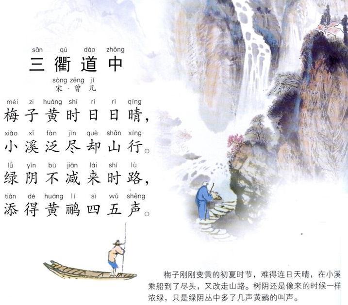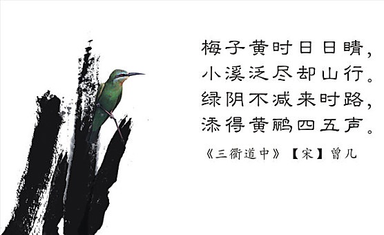 梅子黄时日日晴,小溪泛尽却山行。出自南宋诗人曾几创作的一首七言绝句《三衢道中》。首句写出行时间,次句写出行路线,第三句写绿阴那美好的景象仍然不减登山时的浓郁,第四句写黄莺声,路边绿林中又增添了几声悦耳的黄莺的鸣叫声,为三衢山的道中增添了无穷的生机和意趣。全诗明快自然,极富有生活韵味。