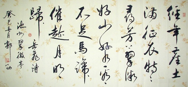 “好水好山看不足,马蹄催趁月明归。”诗的三四两句并没有象一般的记游诗那样,对看到的景色作具体细致的描述,而是着眼于主观感觉,用“好水好山”概括地写出了这次“寻芳”的感受,将秀丽的山水和优美的景色用最普通、最朴实、最通俗的“好”字来表达,既有主观的感受,又有高度的赞美。同时,又用“看不足”传达自己对“好水好山”的喜爱、依恋和欣赏。结尾一句则写了诗人为祖国壮丽的山河所陶醉,乐而忘返,直到夜幕降临,才在月光下骑马返回。“马蹄”,照应了上面的“特特”。“催”字则写出了马蹄声响使诗人从陶醉中清醒过来的情态,确切而传神。“月明归”,说明回返时间之晚,它同上句的“看不足”一起,充分写出了诗人对山水景色的无限热爱、无限留恋。岳飞之所以成为民族英雄,之所以为自己的国家英勇战斗,同他如此热恋祖国的大好河山是密不可分的。诗的结尾两句正表现了作者对祖国山河特有的深厚感情。