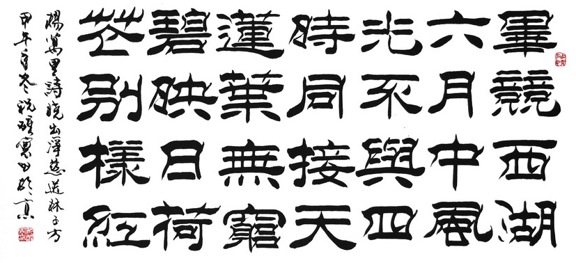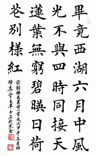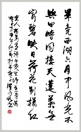 然后,诗人用充满强烈色彩对比的句子,描绘出一幅大红大绿、精彩绝艳的画面:“接天莲叶无穷碧,映日荷花别样红。”这两句具体地描绘了“毕竟”不同的风景图画:随着湖面而伸展到尽头的荷叶与蓝天融合在一起,造成了“无穷”的艺术空间,涂染出无边无际的碧色;在这一片碧色的背景上,又点染出阳光映照下的朵朵荷花,红得那么娇艳、那么明丽。连天“无穷碧”的荷叶和映日“别样红”的荷花,不仅是春、秋、冬三季所见不到,就是夏季也只在六月中荷花最旺盛的时期才能看到。诗人抓住了这盛夏时特有的景物,概括而又贴切。这种在谋篇上的转化,虽然跌宕起伏,却没有突兀之感。看似平淡的笔墨,展现了令人回味的艺术境地。