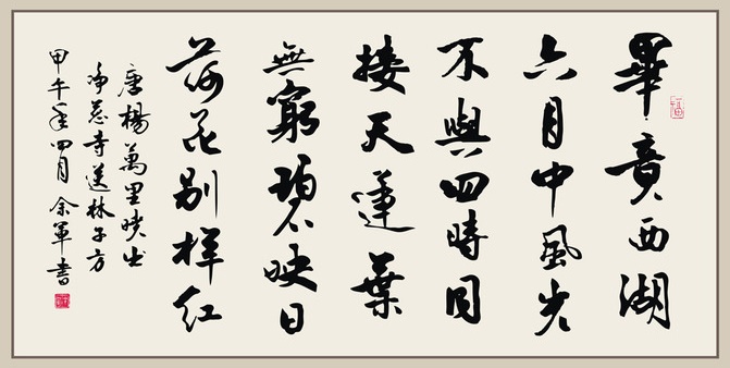 毕竟西湖六月中,风光不与四时同。出自南宋诗人杨万里的组诗作品《晓出净慈寺送林子方二首》。这两首诗通过描写六月西湖的美丽景色,曲折地表达对友人林子方的眷恋之情。其中第二首广为传诵。其首二句以“毕竟”二字领起,一气而下,既协调了平仄,又强调了内心在瞬间掠过的独特感受。然后顺理成章,具体描绘这使他为之倾倒与动情的特异风光,着力表现在一片无穷无尽的碧绿之中那红得“别样”、娇艳迷人的荷花,将六月西湖那迥异于平时的绮丽景色,写得十分传神。诗的后两句是互文,文义上交错互见,使诗句既意韵生动,又凝练含蓄。