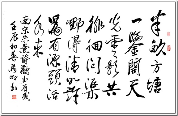 第一首诗是抒发读书体会的哲理诗,描绘事物本身感性的形象时,又蕴涵了理性的东西。“半亩方塘一鉴开,天光云影共徘徊”,半亩的“方塘”不算大,只有半亩地的一个方方的池塘,但它像一面镜子那样地澄澈明净,“一鉴”的“鉴”,就是“镜”,照人的镜子,“镜”和“鉴”是一个意思。“半亩方塘”像一面镜子那样打开了。“半亩方塘”虽然不算大,但它却像一面镜子那样地澄澈明净,“天光云影”都被它反映出来了。闪耀浮动,情态毕见。作为一种景物的描写,这也可以说是写得十分生动的。这两句展现的形象本身就能给人以美感,能使人心情澄净,心胸开阔。这一种感性的形象本身,它还蕴涵着一种理性的东西。很明显的一点是,“半亩方塘”里边的水很深、很清,所以它能够反映“天光云影”;反之,如果很浅、很污浊,它就不能反映,或者是不能准确地反映。