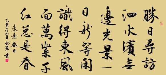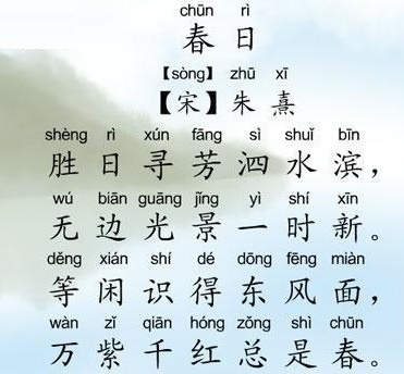人们一般都认为这是一首咏春诗。从诗中所写的景物来看,也很像是这样。首句“胜日寻芳泗水滨”,“胜日”指晴日,点明天气。“泗水滨”点明地点。“寻芳”,即是寻觅美好的春景,点明了主题。下面三句都是写“寻芳”所见所得。次句“无边光景一时新”,写观赏春景中获得的初步印象。用“无边”形容视线所及的全部风光景物。“一时新”,既写出春回大地,自然景物焕然一新,也写出了作者郊游时耳目一新的欣喜感觉。第三句“等闲识得东风面”,句中的“识”字承首句中的“寻”字。“等闲识得”是说春天的面容与特征是很容易辨认的。“东风面”借指春天。第四句“万紫千红总是春”,是说这万紫千红的景象全是由春光点染而成的,人们从这万紫千红中认识了春天。感受到了春天的美。这就具体解答了为什么能“等闲识得东风面”。而此句的“万紫千红”又照应了第二句中的“光景一时新”。第三、四句是用形象的语言具体写出光景之新,寻芳所得。