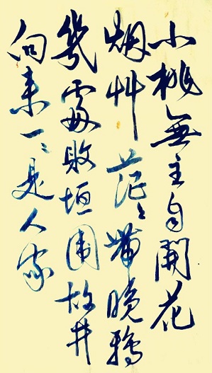 寂寞的一株小桃树,没人欣赏,默默地开着红花。满眼是迷离的春草,笼罩着雾气,黄昏里盘旋着几只乌鸦。一处处毁坏倒塌的矮墙,缭绕着废弃的水井;这里与那里,原先都住满了人家。