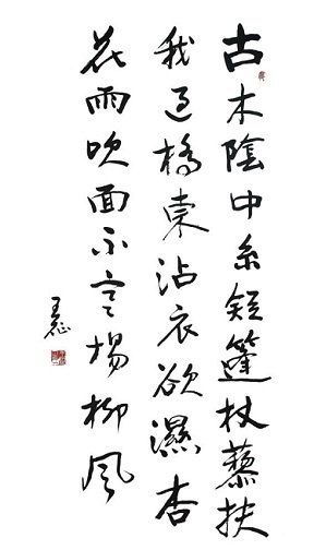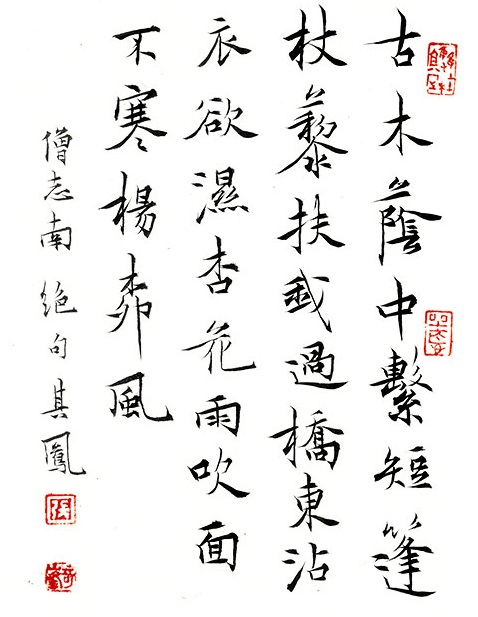 这首小诗,写诗人在微风细雨中拄杖春游的乐趣。诗前两句叙事。写年老的诗人,驾着一叶小舟,停泊到古木阴下,他上了岸,拄着拐杖,走过了一座小桥,去欣赏眼前无边的春色。诗人拄杖春游,却说“杖藜扶我”,是将藜杖人格化了,仿佛它是一位可以依赖的游伴,默默无言地扶人前行,给人以亲切感,安全感,使这位老和尚游兴大涨,欣欣然通过小桥,一路向东。桥东和桥西,风景未必有很大差别,但对春游的诗人来说,向东向西,意境和情趣却颇不相同。 “东”,有些时候便是“春”的同义词,譬如春神称作东君,东风专指春风。诗人过桥东行,正好有东风迎面吹来,无论西行、北行、南行, 都没有这样的诗意。