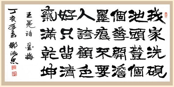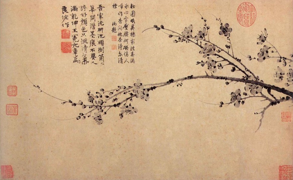 这是一首作者王冕题咏自己所画梅花的诗作。画作为《墨梅图》,纸本,墨笔,纵31.9cm,横50.9cm。自题:“吾家洗砚池头树,个个花开淡墨痕。不要人夸好颜色,只留清气满乾坤。王冕元章为良佐作。”钤“元章”、“文王子孙”。另有清乾隆皇帝御题诗及鉴藏印。画面中一枝梅花横出,枝干秀挺,花朵疏朗。以淡墨点染花瓣,再以浓墨勾点萼蕊,墨色清润,高情逸趣溢于笔端。