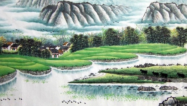 在绿水盈盈、芳草萋萋的美景里,春天的美丽的光景仿佛快要从春雨中走过的样子。