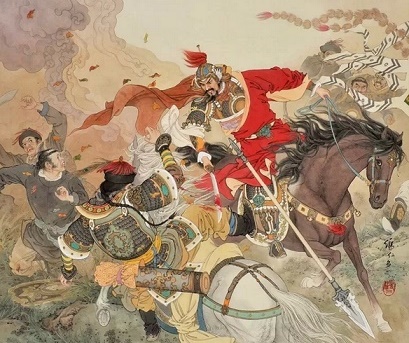 大风送来清脆而雄劲的角声,夕阳的余辉照在大旗上,红艳鲜明。